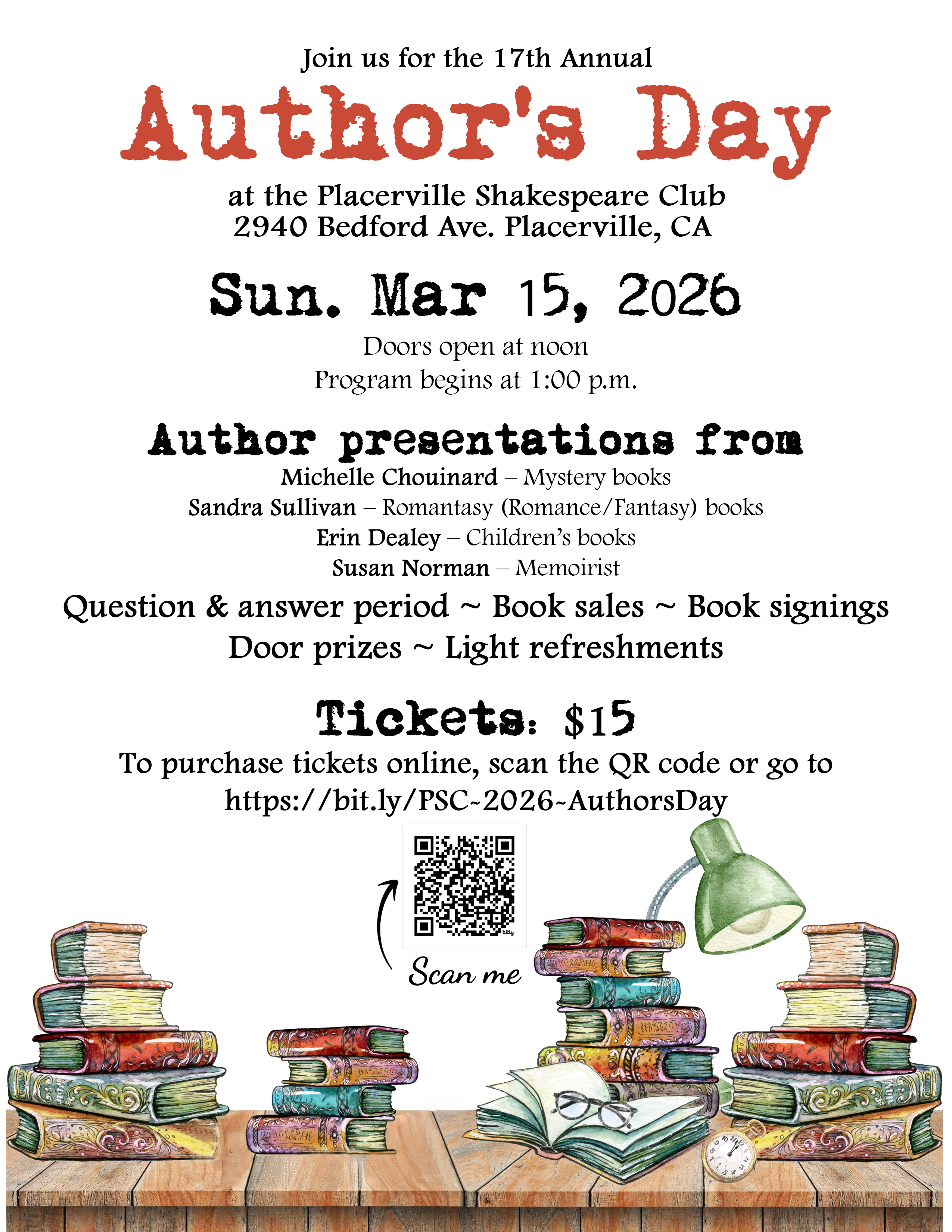 On Sunday, March 15, the Placerville Shakespeare Club will present their 17th Annual “Authors’ Day” for the community, featuring author presentations, question & answer period, book sales, book signings, door prizes and light refreshments. The doors will open at noon with the program beginning at 1:00 p.m. at the Placerville Shakespeare Clubhouse, 2940 Bedford Avenue. Tickets are $15. All event proceeds will fund scholarships for local students. For tickets/information see https://placerville-shakespeare.com/homepage/ClubEvents/ or call 530-644-1704. Tickets will also be available at the door.
