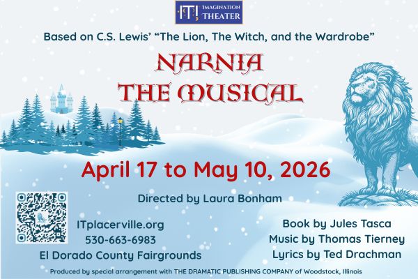 Performances are April 17 – May 10, 2026, at Imagination Theater! on the El Dorado County Fairgrounds. Laura Bonham directs this magical production, featuring two casts of local youth talent. Tickets now available at https://www.itplacerville.org/2026-season/narnia-the-musical/