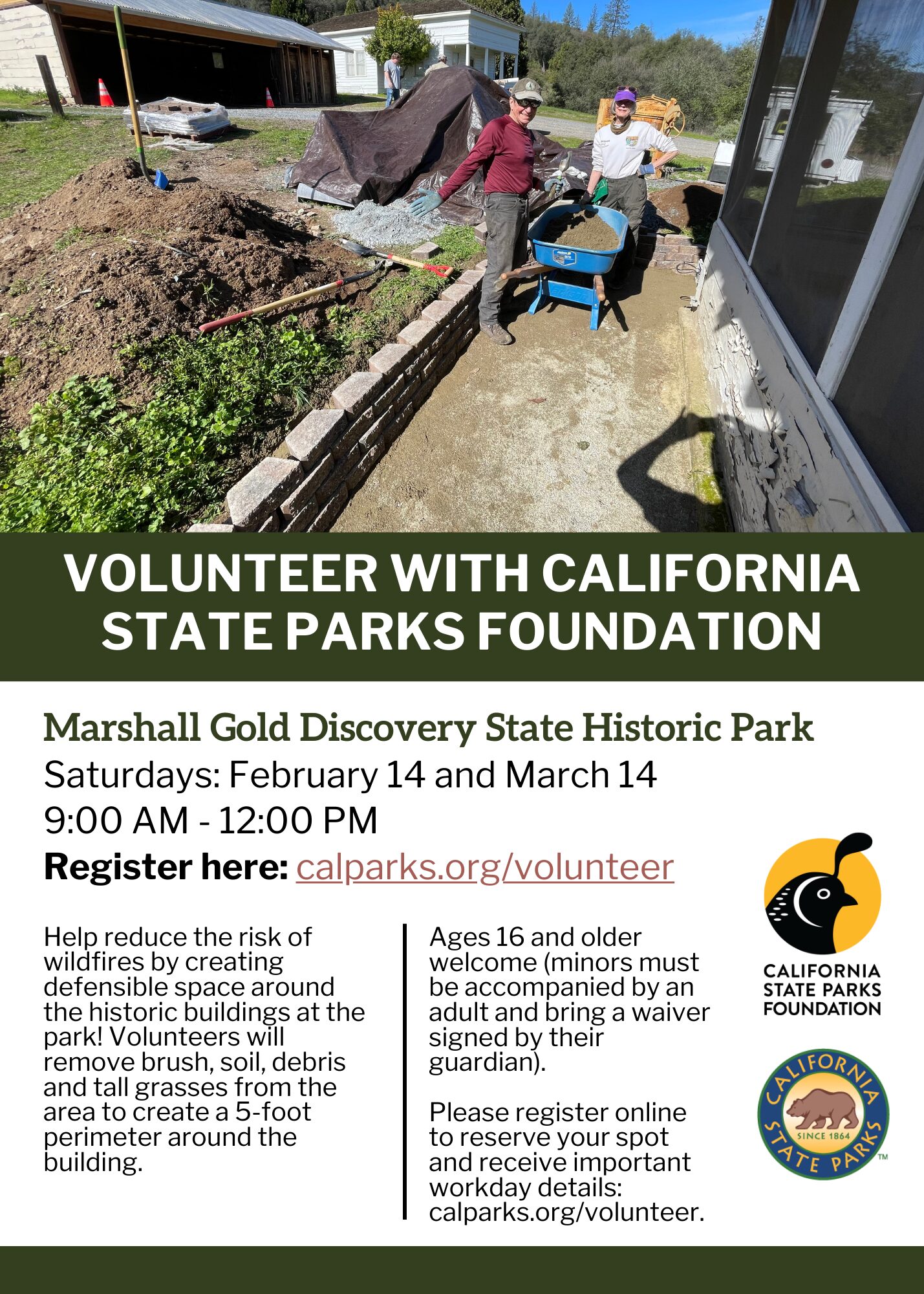 <p class="">Join our volunteer community! Help reduce the risk of wildfires by creating defensible space around the historic buildings at the park. Volunteers will remove brush, soil, debris and tall grasses from the area to create a 5-foot perimeter around the building. They will then fill the cleared space with decomposed granite. This will inhibit flame travel and create a noncombustible barrier around the foundation of the house. Ages 16 and older welcome (minors must be accompanied by an adult and bring a waiver signed by their guardian). </p>